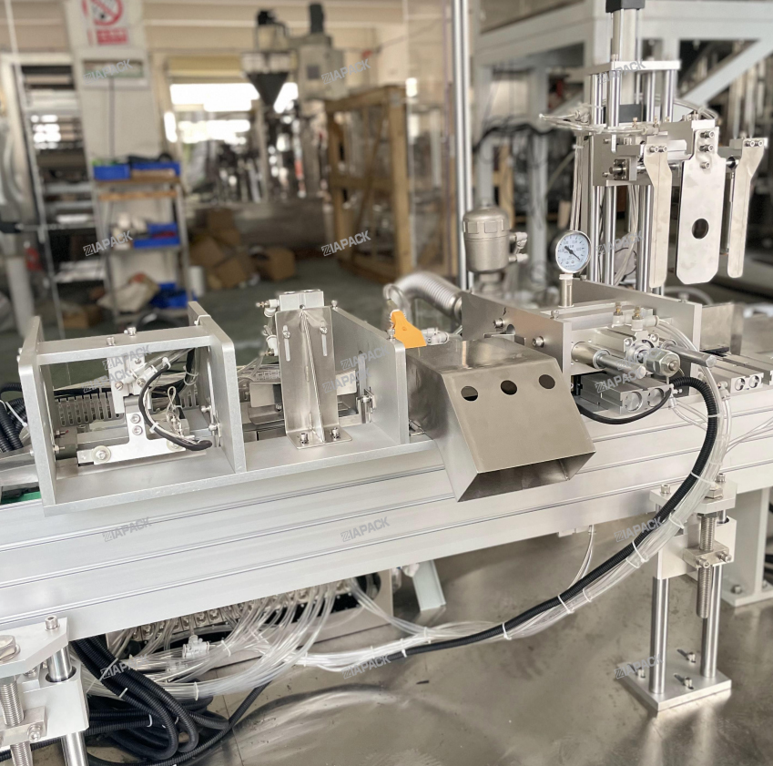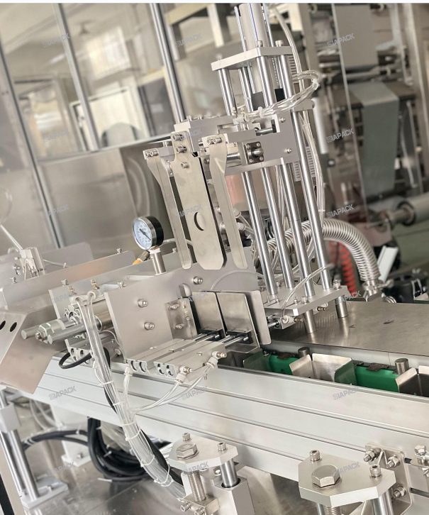 Tento stroj má špeciálny dizajn na výrobu klinového vrecka s horným označením. Po naplnení vrecka s produktom na tomto stroji. Tento stroj unesie vrecko, prejde jednorazovým preložením vrecka a potom nalepí štítok. Rám stroja vyrobený spoločnosťou SUS304 .PLC a dotykový displej značky Siemens .A pneumatické časti prijímajú značku SMC .Hlavné elektrické komponenty prijímajú značky Omron a Schneider.Tento stroj pracuje s automatickým baliacim strojom na dosiahnutie hotového označovania vrchu vrecka .Tento stroj môže automaticky dosiahnuť funkciu etikety oddelené ,Odoslanie etikety .Detektor etikety a lisovanie etikety .
