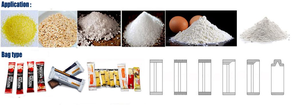 Tento stroj sa používa hlavne na balenie výrobkov z prášku: ako sušené mlieko, mliečny čaj, prášok z kávy, korenie, prášok z kari, proteínový prášok, korenie, bylinný prášok, chemické a lekárske práškové produkty.