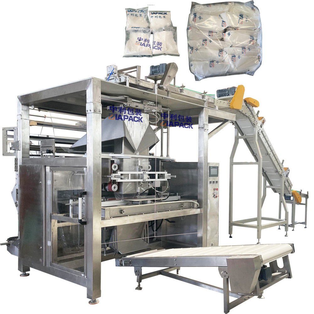 Tento stroj je vhodný na balenie malého vrecka do veľkého vrecka. Stroj dokáže automaticky vyrobiť vrecko a naplniť malé vrecko a potom utesniť veľkú tašku. Tento stroj vrátane mechov: